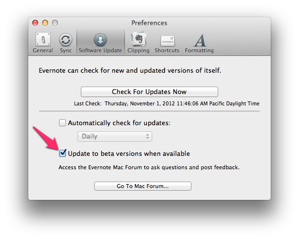 1. Download and install Evernote 3.3. Note that you must install this download – you cannot upgrade by downloading the version in the Mac App Store and then applying step two.